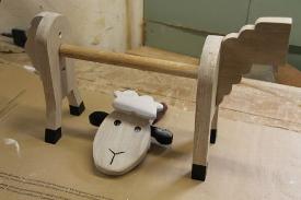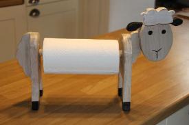 I had been asked to make a kitchen towel holder/dispenser some time ago. I already have a collection of farmyard animals, chicken egg rack, goose doorstop and duck washing up brush holder. I had seen a label roll holder in a pharmacy, head and tail to represent a sheep and a rod for the body which held the rolls of labels. This was used as the basis for my design.