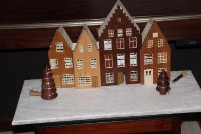 Once all the pieces had been sanded and oiled, we had to decide how to arrange the trees relative to the row of houses. Once the layout had been agreed, holes were drilled so the battery boxes for the lights would be accessible but would be out of sight under the base board.