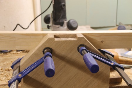 Three pieces of oak were biscuit jointed to form the seat and this was slightly hollowed on the top to make it more comfortable by cutting concentric levels with the router then sanding to produce the final shape. I cut off the corners to form an octagon then jointed a stave in to each corner.