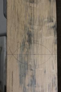 To be any use I needed to find a way to create right angle cuts for length, Who would have thought O level geometry would come in to its own!! I marked centre lines on the staves and then using compasses marked a perpendicular to the centre line, Squared off one end then measured across the back of the stave to get the required length, again marking a right angle at the required point.