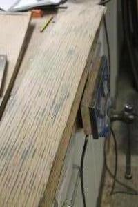 Once the staves had been cleaned, the fun really started. Barrels by their nature are curved, bowed in their length, irregular chamfer on both long edges and varying in width, narrow at the ends and wider in the middle. Also as these staves were from a huge stack they had come from different barrels which gave a further variation in shape.