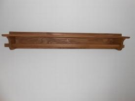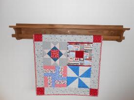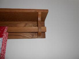A quilt rail is a shelf supported either end by shaped brackets. Between these brackets a rail is suspended to carry the quilt so it is displayed under the shelf. Quilts can be quite heavy so the rail needs to be of sufficient section to carry the weight without bending, there also needs to be some sort of fixing or control for the rail so it stays in place.