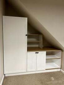 The design involved a tall cupboard with extending rail in the top to store coats, then a low cabinet one half with doors, the other half with open shelving. On top of this lower section I added a small half depth shelving unit to utilise more of the under stair space.